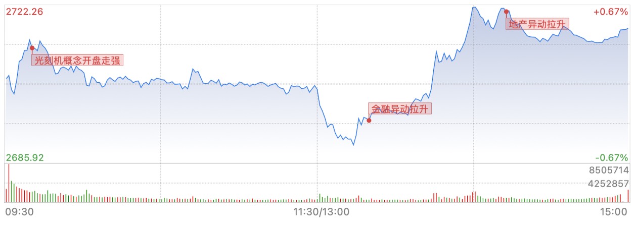 大盘一度跌破2700,盘中银行股、地产、金融开始发力,带动大盘回升。