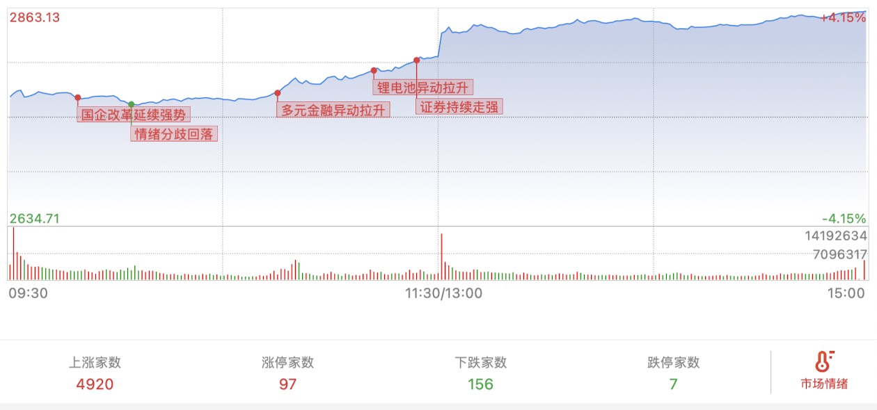 24.09.24,星期二,三大指数高开高走,上证上涨100个点到2863,4个点的涨幅。两市成交9800亿,上涨家数4920家,下跌156家。其中涨停97家,跌停7家。