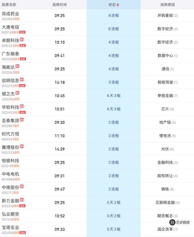 盘中大利好,利好大金融、证券、多股涨停带动大盘高潮。恒银科技、新力金融一字,弘业期货大长腿涨停,证券天风证券、锦龙股份、太平洋等涨停。