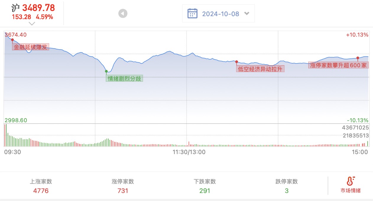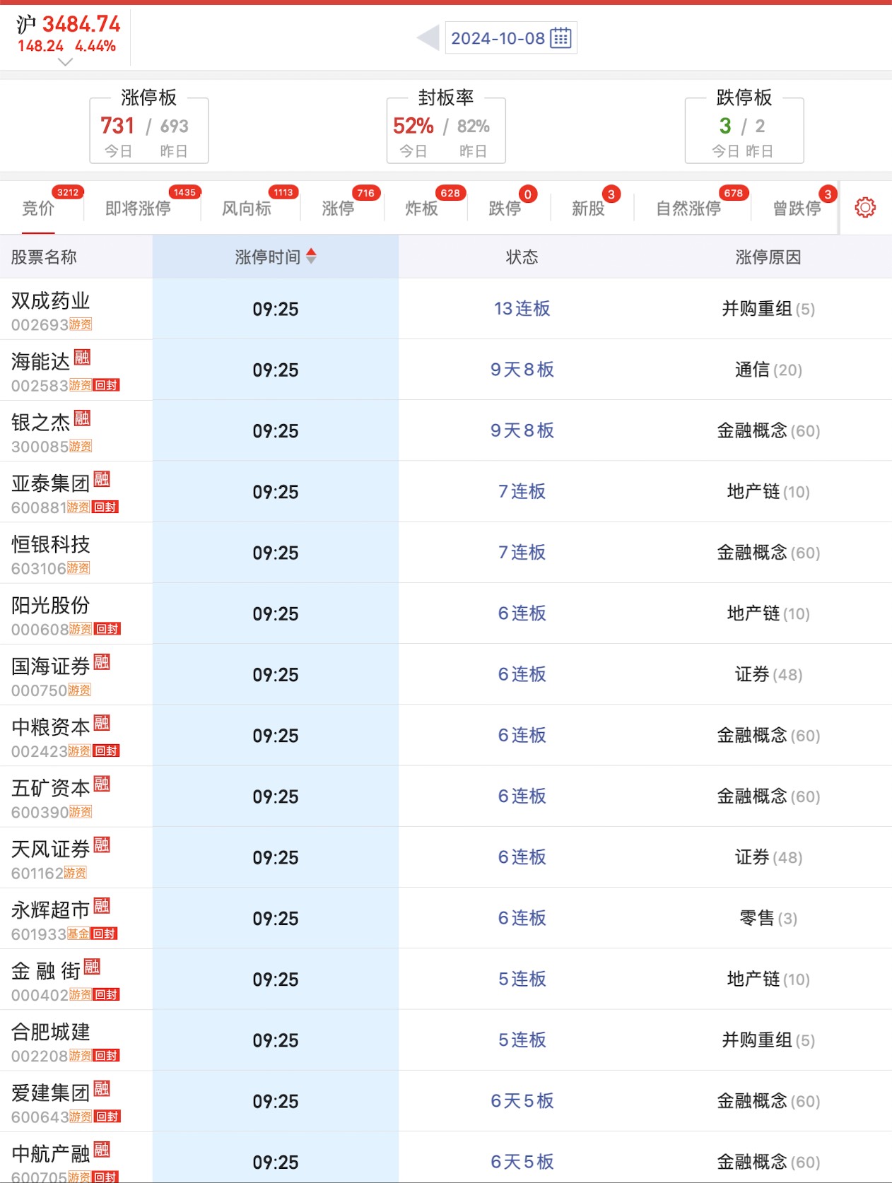 24.10.08,星期二,经过国庆假期的发酵,千只个股开盘即涨停。连带着大盘都是涨停开,也是见证了历史。另外成交额再一次刷新,3.5万亿。超4700家上涨,731家涨停。