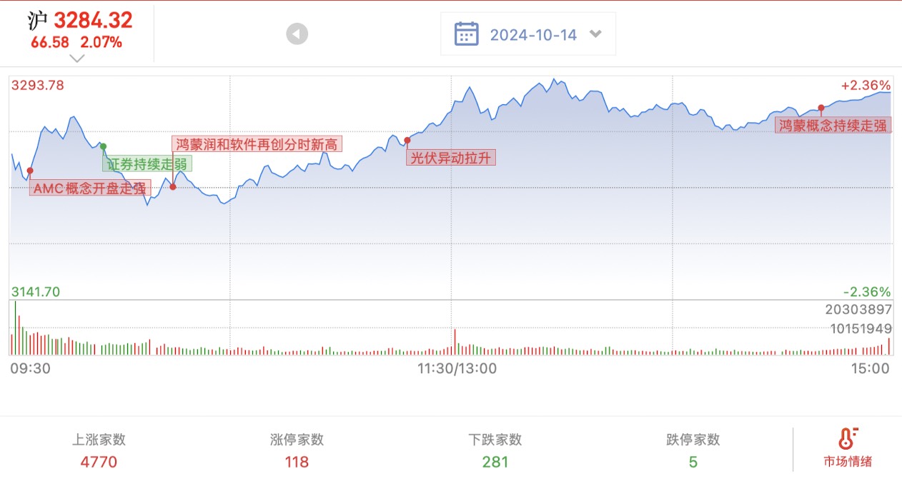 24.10.14,星期一,三大指数高开回落后震荡走强,两市成交1.63万亿,小幅放量。