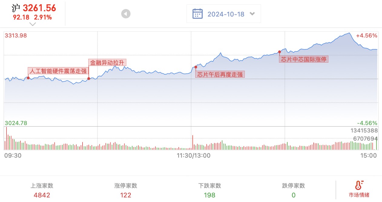 24.10.18,星期五,三大指数放量大涨,成交2万亿。上涨个股金5000家。