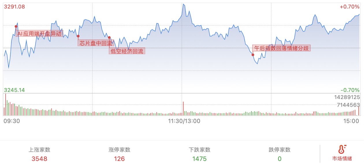 从盘面看,AI应用端发酵,传媒、Sora短剧强势,中文在线涨停,智度股份2板。芯片和低空,今天分歧,士兰微盘中炸板,万丰奥威作为中军,上午盘中涨停,午后炸板到均线以下,龙头宗申动力回封。消费电子的领益智造直线拉板,午后分歧。