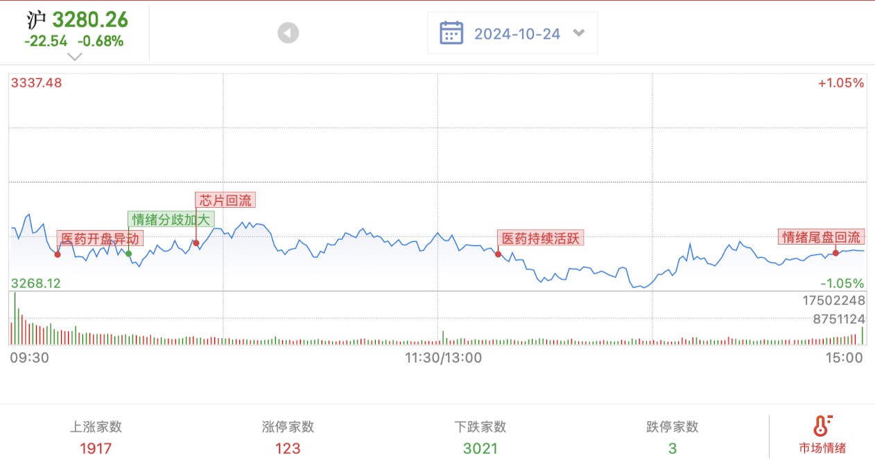 24.10.24,星期四,三大指数弱势震荡,沪指下跌-0.6%。两市成交1.52万亿,缩量21%。相对来说大幅缩量。下跌超3000家。