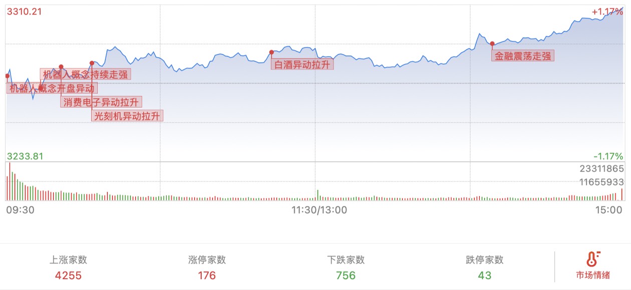 24.11.x,星期一,三大指数震荡走强,上证重回3300点。两市成交1.7万亿,缩量24%。上涨超4000股。