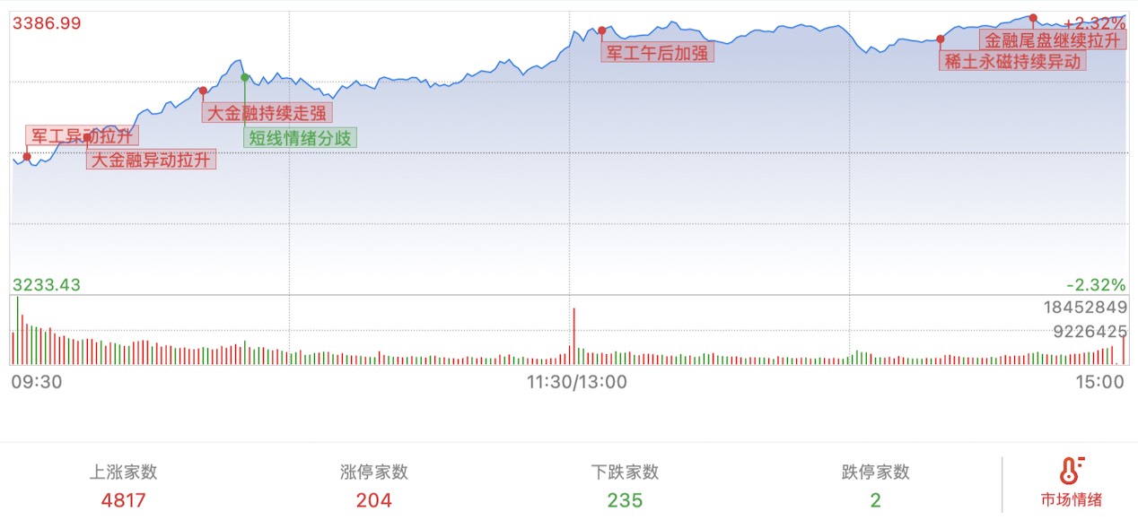 24.11.5,星期二,三大指数全天走强,两市成交2.3万亿,放量35%,上涨家数4800+家,下跌235家。其中涨停204家,跌停2家。