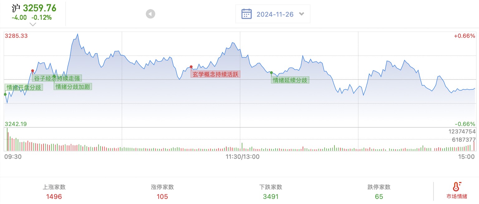24.11.26,星期二,三大指数弱势震荡,两市缩量成交1.3万亿,缩量12%。上涨1495家,下跌3491家。市场割裂,短线负反馈明显,各种天地板。
