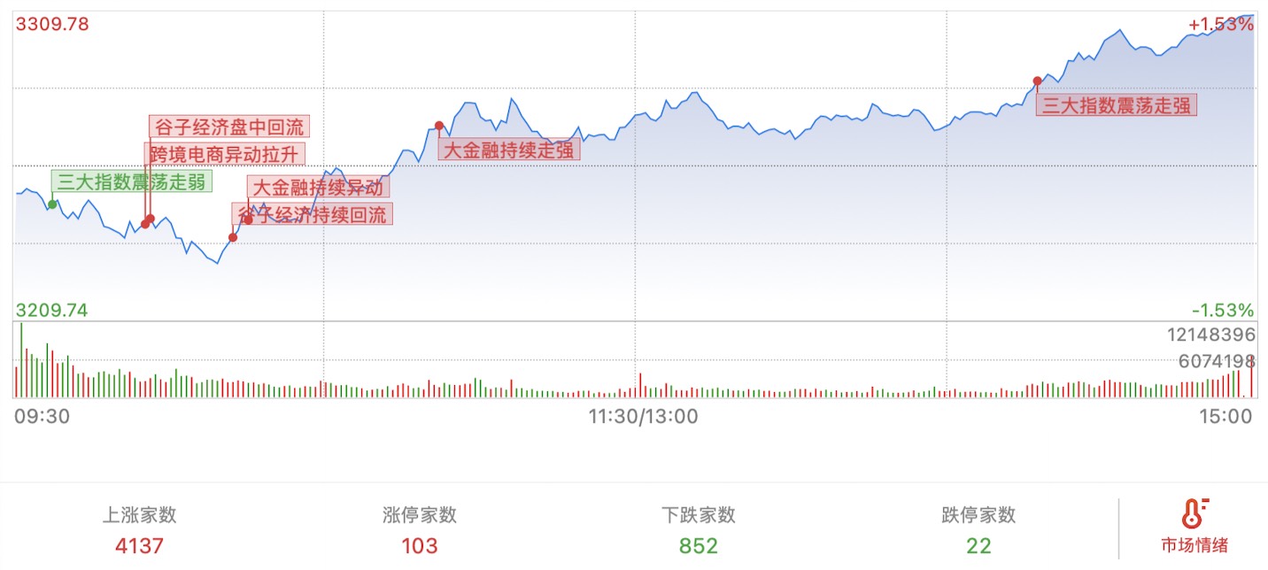 24.11.27,星期三,三大指数探底回升,午后持续走强,两市成交1.45万亿,放量11%,上涨4137家。其中涨停103家,跌停22家。