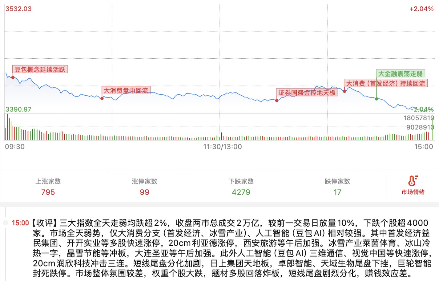 24.12.13,星期五,三大指数震荡走弱,两市成交2万亿,较昨日放量10%。下跌超4000家。