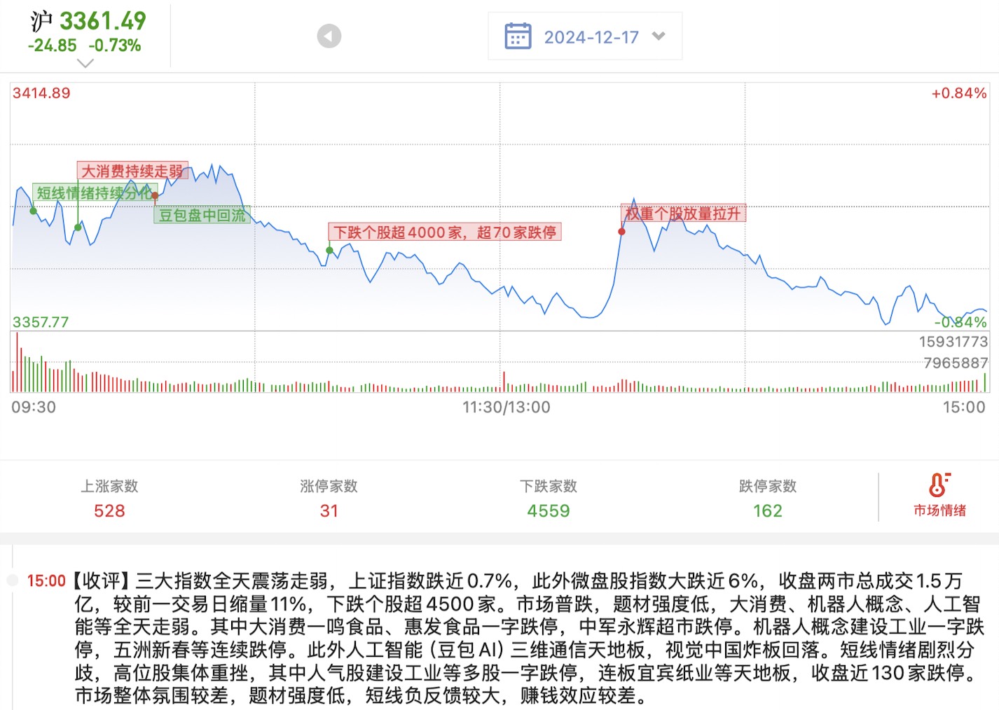 24.12.17,星期二,三大指数震荡走弱,两市成交1.5万亿,较昨日缩量11%。