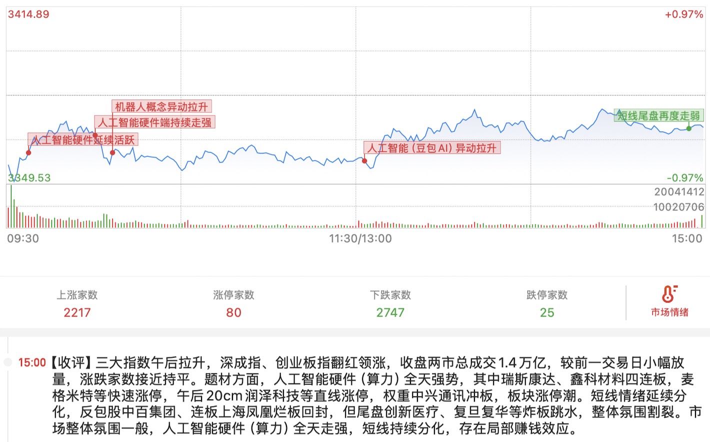 人工智能继续有资金来博弈。豆包概念发酵,早上佳力图秒板,大成交中兴通讯大阳线,午后利好刺激,城地香江、亚康股份涨停,兆易创新成绩二板,浪潮信息涨停。
