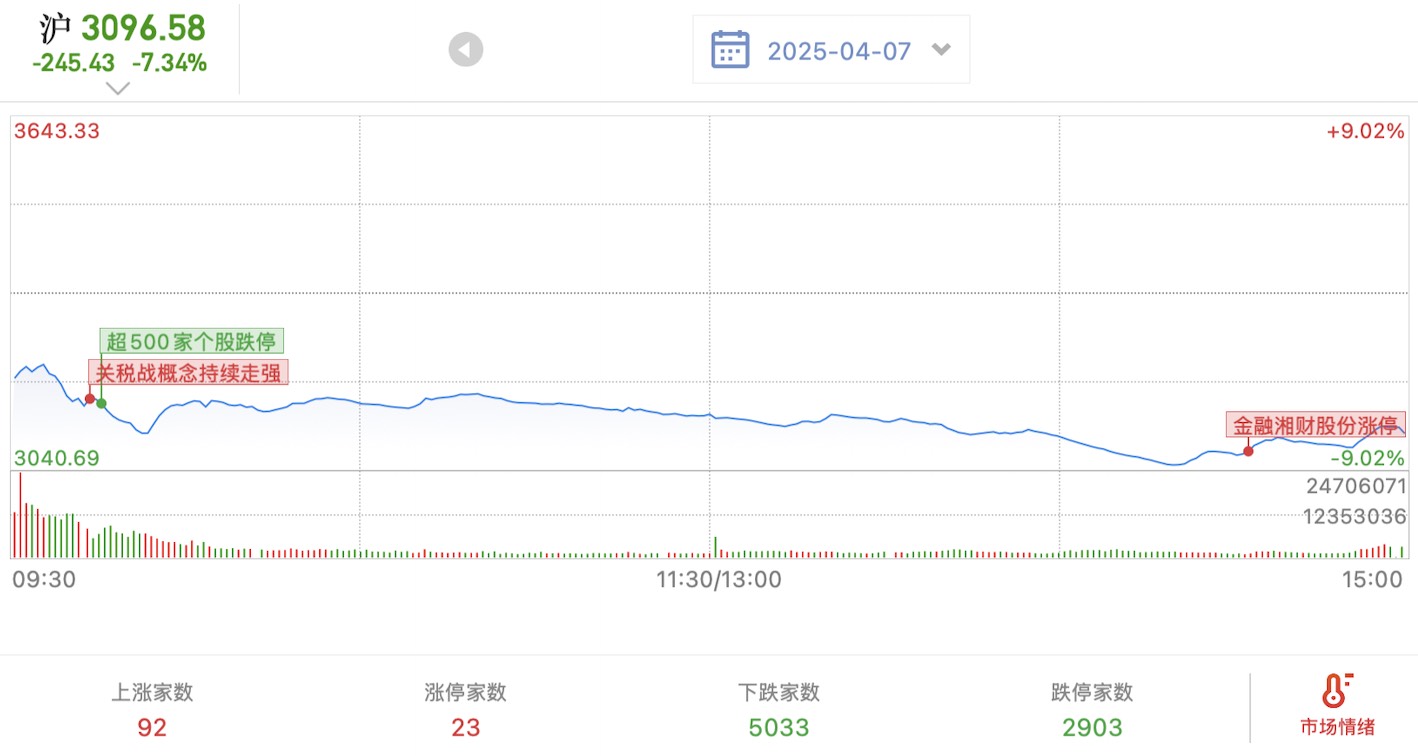 24.4.7,星期一,好久没有写了,今天受关税影响,A股出现了2900多只跌停,一度超过3000只。截止收盘,沪指下跌-7.34%,一度下跌9%。