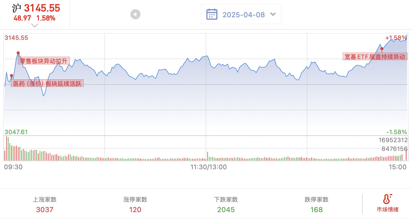 关税战并没有结束,昨天的3000跌停,在今天早盘又一次恐慌性砸盘之后,开始慢慢企稳,再加上政府的资金流入,尤其是尾盘持续异动。
