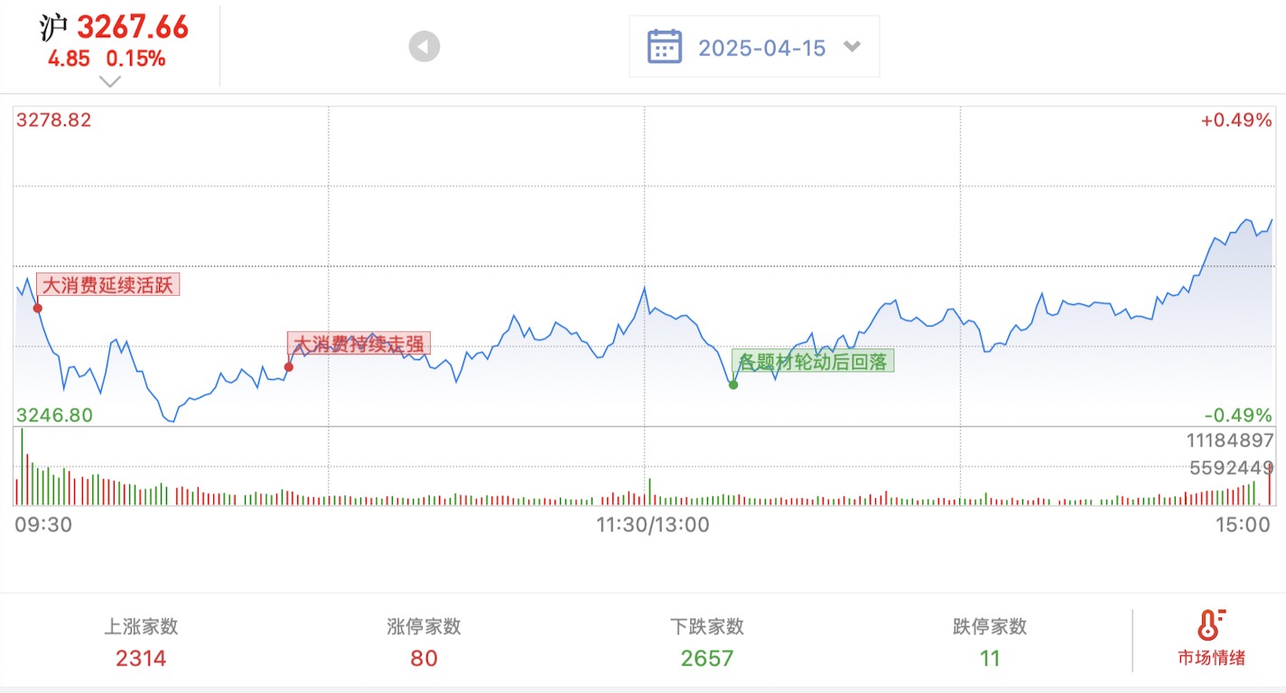 24.4.15,星期二,三大指数弱势震荡,两市成交不足1.1万亿,较昨日大幅缩量15%。其中涨停80家,跌停11家。整体比较难做。