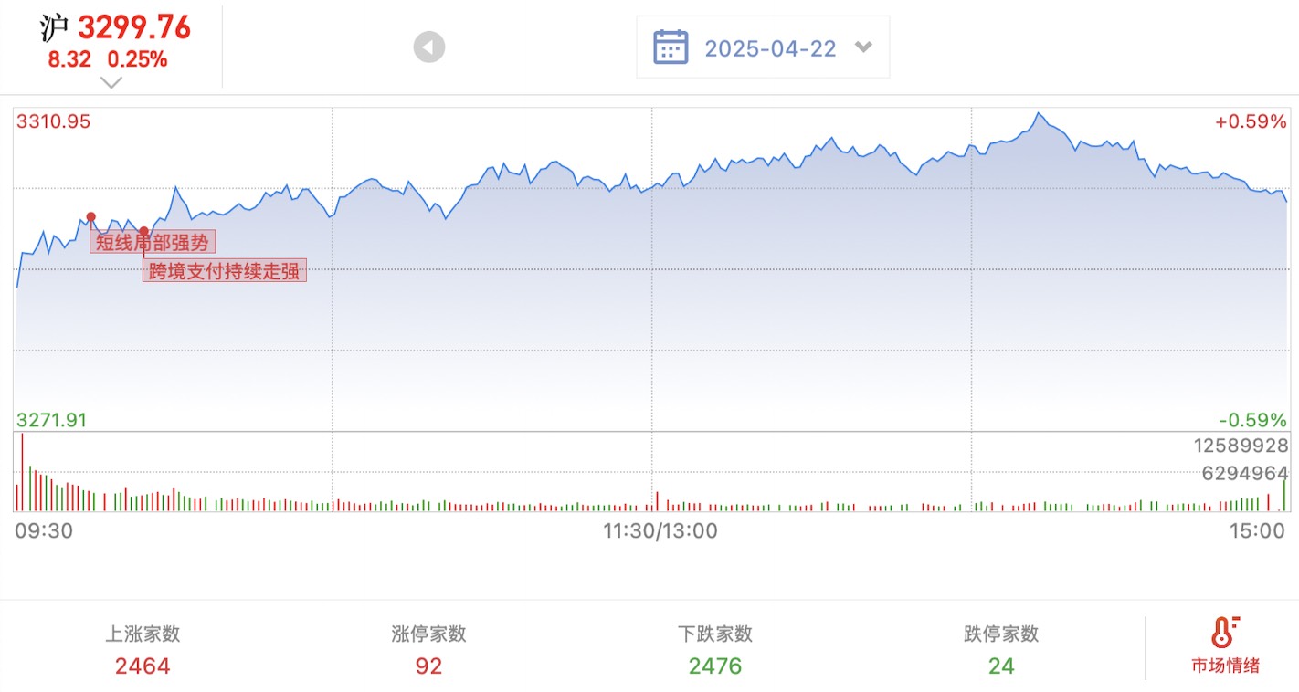 24.4.22,星期二,三大指数窄幅震荡,两市成交1.09万亿,较昨日放量4.6%。上涨下跌家数持平。其中涨停92家,跌停24家。